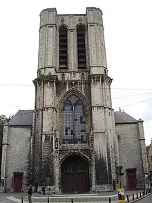 A construção da atual igreja gótica foi provavelmente iniciada em 1440, e ocorreu em duas fases, separadas por um intervalo longo. Durante a primeira fase, entre os séculos XV e XVI, a parte ocidental do edifício foi construída, incluindo a torre, a nave e o transepto. Estes foram concluídos em 1528. A construção da torre ocidental continuou e em 1566 dois níveis da torre foram concluídos. Em seguida, devido a conflitos religiosos, não apenas a construção parou, mas ocorreu uma pilhagem. Parte da igreja foi destruída por calvinistas em 1578, e em 1579 o antigo coro foi demolido.