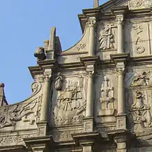 A grandiosa e elegante fachada de granito foi trabalhada, durante muitos anos, por cristãos japoneses exilados e artistas locais, sob a orientação do jesuíta italiano Carlo Spinola. Tem 23 metros de largura e 25,5 metros de altura. Esta fachada foi construída com base no conceito clássico da divina ascensão, por isso está dividida em 5 níveis horizontais encimados por um frontão triangular. Cada nível da fachada representa um determinado estado da caminhada espiritual ascendente do crente ao Paraíso, que é o último estado desta longa caminhada cristã e o lugar onde vão todos os homens que, resistindo à tentação do Diabo, conseguiram fazer a caminhada toda e alcançar a santidade. Por isso, o frontão (o quinto e último nível) simboliza a Santíssima Trindade, que vive no Paraíso.
