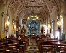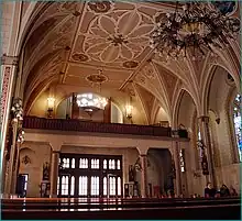 À esquerda, mais ao fundo, um púlpito de madeira ricamente entalhada e decorada com arabescos e gárgulas, com um alto pináculo sobre a cobertura. Destacam-se ainda dois preciosos altares laterais, também de rica talha neogótica, mostrando diversas estátuas de santos de fino acabamento. O da esquerda é dedicado principalmente a Jesus, e o da direita, à Virgem Maria, junto com outros santos.[3]