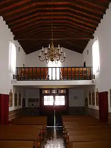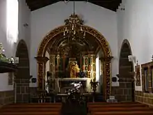O interior apresenta nave única, com destaque para os arcos de comunicação com os braços do falso transepto em cantaria e com bases e impostas muito salientes, o portal de comunicação com a sacristia, e uma intervenção mais recente que inclui um lambril de pedra (capeada) que se estende envolvendo os vãos de algumas portas e do confessionário. Da mesma época serão as molduras em pedra, de ambos os lados da nave principal, que enquadram catorze painéis de azulejo com os passos da paixão de Cristo. O arco da capela-mor, de invocação de São Pedro, é forrado em talha e tem, no cimo, as Armas Reais Portuguesas. Nesta capela, além da imagem do padroeiro, encontram-se a de São José e a de Santa Ana, e um valioso crucifixo de marfim, tendo estas últimas imagens vindo do Convento de Nossa Senhora da Vitória em Vila do Porto. O sacrário por sua vez, pertenceu à Igreja do Recolhimento de Santo António na mesma vila.[6]