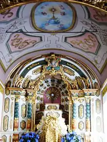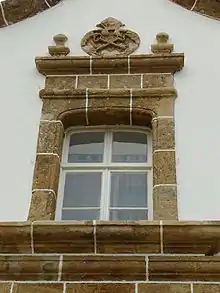 O terço central, cuja cornija se prolonga na horizontal para os terços laterais, tem um remate apontado com a ponta encimada por uma cruz em pedra.