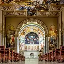 A igreja ganhou fama em virtude de um grupo de obras de arte que abriga. A mais importante, sem dúvida, é a série de murais e pinturas em tela de Aldo Locatelli. Em 1951, Aldo Locatelli inicia as pinturas da Igreja com o mural da Santa Ceia, de 90 metros quadrados de área, ladeada pela Aparição do Sagrado Coração de Jesus a Santa Margarida Maria Alecoque, à esquerda, e a Aparição de Nossa Senhora de Caravaggio à vidente Joaneta, à direita. Os murais também cobrem todo o teto da igreja, ilustrando a Criação do Cosmo, a Criação da Mulher, a Expulsão do Paraíso e o Juízo Final, rodeados de uma série de caixotões com imagens inspiradas no hino Dies irae. Seus trabalhos se prolongaram até 1960 com as telas da Via Sacra, imaginada com grande dramaticidade e gênio. Sobre a Via Sacra também foram acrescentadas pinturas murais de grandes anjos. Locatelli teve a colaboração de Emilio Sessa, autor de elementos decorativos como molduras, frisos, marmorizados, arabescos, além de fundos celestes para os anjos das paredes laterais.[6] As pinturas que Locatelli deixou nesta igreja são consideradas sua obra-prima, fundamental para o estudo do seu estilo e legado e uma contribuição de grande destaque na história da arte sacra no estado.[7][6]