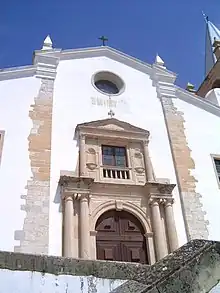 A igreja possui planta longitudinal composta por nave rectangular, com dois corpos laterais, capela-mor, capelas laterais e sacristias anexas. A fachada principal está ladeada por dois torreões, vazados no primeiro registo por arcos plenos, sendo o da direita rematado por torre sineira com coruchéu azulejado, e o do lado oposto apenas por sineira. O pano central da fachada, dividido em dois registos, apresenta portal em arco pleno, inserido em estrutura retabular, num modelo que deriva das fachadas-retábulo elaboradas por Nicolau de Chanterene e João de Ruão e que a arquitetura maneirista adopta como suas, depurando-as da decoração ornamentalista dos mestres renascentistas e imprimindo-lhes formas depuradas de gosto classicista. O programa decorativo do portal consta da utilização de duas ordens arquitetónicas na sua estrutura: no primeiro registo, na delimitação do portal, a ordem jónica, no segundo registo, ladeando a janela e os nichos a ordem coríntia. Sobre o portal foi rasgado um óculo. A fachada é rematada em empena, com pináculos.[1]
