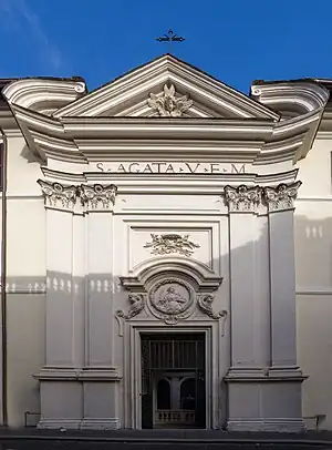 A fachada foi reconstruída por Francesco Ferrari em 1729 e o relevo esculpido acima da porta mostra Santa Águeda segurando num prato seu seio que lhe foi arrancado quando ela se recusou a renunciar à sua fé.