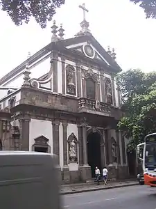 A fachada também se afasta do modelo mais seguido no Rio de Janeiro colonial por não estar ladeada por duas torres, pois a torre sineira da igreja está localizada nas traseiras do edifício. Atualmente os quatro nichos da fachada tem estátuas dos Evangelistas trazidas da Itália em 1926. As duas estátuas de madeira originais dos nichos superiores, representando São Mateus e São João Evangelista, foram realizadas por Mestre Valentim e encontram-se hoje no Museu Histórico Nacional.