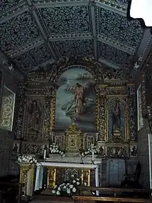 O interior, de nave única, termina em arco triunfal de traçado ogival, assente em quatro meias colunas (duas de cada lado), com capitéis profusamente decorados com motivos geométricos, vegetalistas e zoomórficos (pares de aves a beber do mesmo cálice e outro a devorar uma presa e quadrúpedes). A capela-mor alberga quadros, imagens dos quatro Evangelistas, talha dourada e cobertura em caixotões, com decoração a ouro, resultantes de campanhas ulteriores, nomeadamente das realizadas já em período barroco. As paredes laterais estão revestidas a azulejos de tapete.