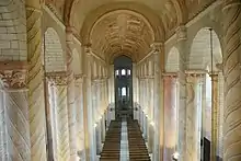 Basilica: A nave central tem dois pisos mais que as colaterais, o trifório e o clerestório.