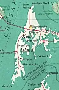 A ilha faz parte da região de Queen Anne's County, Maryland, e da costa leste de Maryland. O primeiro estabelecimento inglês na ilha, Kent Fort, foi fundado em 1631, fazendo de Kent Island o assentamento inglês mais antigo do estado atual de Maryland e o terceiro assentamento inglês permanente mais antigo do que se tornaram os Estados Unidos - depois de Jamestown, Virgínia (1607) e Plymouth, Massachusetts (1620).[2][3] Os locais designados pelo censo de Stevensville e Chester estão localizados na ilha, junto com várias outras comunidades, incluindo a comunidade pesqueira de Kent Narrows, que está parcialmente localizada na ilha. Embora todas as comunidades de Kent Island não sejam incorporadas, os locais designados pelo censo de Stevensville e Chester na ilha são mais populosos do que qualquer uma das cidades incorporadas no Condado de Queen Anne.