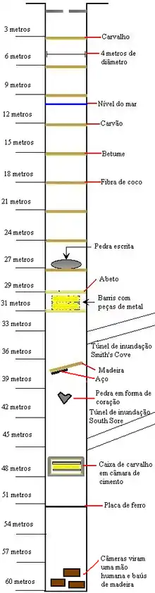 Continuaram descendo para 27 m, encontrando uma camada de cascalho a cada intervalo de 3 m. Mesmo com as camadas, aos 12 m uma camada de carvão foi encontrada. Aos 15 m uma camada de piche, e a 18 m uma camada de fibras de coco.
