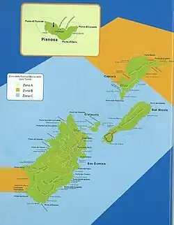 Pianosa pertence integralmente a Zona A, ou Reserva Marinha Integral. É proibida a navegação e desembarque a menos de 500 metros, assim como a pesca e mergulho, a menos que haja acompanhamento de guias de mergulho autorizados.[3]