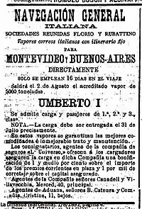A maior entrada de italianos no Uruguai ocorreu entre 1880 e 1890, quando 60% do total de imigrantes chegaram ao país sul-americano.[23] Enquanto 63.000 italianos chegaram a Montevidéu entre 1880 e 1889, somente entre 1887 e 1889 chegaram a mais de 45.000 italianos.[29] Um censo de 1889 indicava que metade da população de Montevidéu havia nascido no Uruguai e os italianos eram quase metade da população estrangeira.[24] A presença dos europeus em geral e dos italianos em particular deu ao povo uruguaio sua aparência característica: o antropólogo brasileiro Darcy Ribeiro iria definir os uruguaios como um "povo transplantado",[30] sendo também qualificados como "descendentes dos navios".[28] No ano seguinte, foi criada a "Lei de Imigração e Colonização", que favorecia os imigrantes. Com relação a essa nova lei, o escritor uruguaio Eduardo Acevedo indicou em seu livro "Anales históricos del Uruguay":