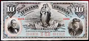 Tradicionalmente, a comunidade italiana que residia no Uruguai apoiava o Partido Colorado.[72][73] Embora o Partido Colorado favorecesse a imigração italiana,[74] principalmente urbana e comercial, o outro partido tradicional do Estado Oriental do Uruguai, o Partido Nacional, estava mais estreitamente ligado às antigas tradições rurais espanholas.[75] Durante a Grande Guerra, o militar Giuseppe Garibaldi formou a Legião Italiana - composta por cerca de 630 imigrantes italianos - e lutou ao lado dos colorados comandados por Fructuoso Rivera para defender a cidade dos brancos e de Buenos Aires, que eles esperavam que fossem invadir da periferia.[76][77] Em 2 de junho de 1882, cinco dias antes da morte de Garibaldi, foi fundado o "Círculo Legionário Garibaldino", uma sociedade em sua honra.[78] Por suas lutas na Itália e na América do Sul, Garibaldi foi chamado de "o herói de dois mundos" e no início do século XX, início da hegemonia política do Partido Colorado, a figura do exército italiano foi elogiada como símbolo da italianidade e do ideal de liberdade.[79][80] Comemorando o primeiro centenário de seu nascimento, em 4 de julho de 1907, o então presidente do Uruguai José Batlle y Ordóñez decretou um feriado nacional e presidiu uma celebração a cerca de quarenta mil pessoas em Montevidéu. Em 1915, o sucessor presidente, Feliciano Viera - também colorado - declarou um feriado nacional em 20 de setembro.[80] Em 20 de setembro foi realizado o evento mais importante da comunidade italiana, que também foi transmitido na Argentina e no Brasil, e naquele dia, em 1919, um festival nacional uruguaio conhecido como "o dia da Itália" também foi celebrado.[79]