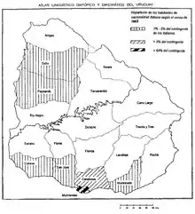 Dada a sua baixa escolaridade, os primeiros imigrantes que chegaram na segunda metade do século XIX costumavam falar a língua ou o dialeto de sua região de origem e um produto de língua franca da mistura de mais de um dialeto.[11][55] Foi com a cidade de Montevidéu sitiada e décadas antes da unificação da Itália, quando a ideia da unidade italiana e o uso de uma linguagem comum começou a ser promovida no território uruguaio.[56] A integração desses imigrantes na vida social uruguaia foi facilitada pela proximidade linguística com a língua espanhola. Uma vez estabelecida, a conservação do italiano ao longo do tempo dependia de vários fatores, como idade, conformação familiar, nível cultural, tipo de trabalho realizado, ligações com a pátria ou tradições.[55] Por sua vez, após a independência, o Estado uruguaio planejou um país linguisticamente homogêneo e suas políticas de alfabetização em espanhol desencorajaram o bilinguismo.[11] Estudos realizados pela Universidade da República do Uruguai indicaram que os imigrantes usavam sua língua materna e o uso do espanhol era influenciado por isso, a geração seguinte - nascida no Uruguai - aprendeu italiano na família, mas não interferiu no uso do espanhol e a terceira geração perdeu a língua ou dialeto de seus antepassados e falava um espanhol igual ao da população local. Essas investigações também sugeriram que a língua italiana foi perdida mais rapidamente no Uruguai do que em outros lugares, como Nova Iorque, já que os italianos no Uruguai foram mais facilmente assimilados.[57][42] Para o linguista uruguaio Adolfo Elizaincín, era comum que os filhos dos imigrantes abandonassem a linguagem de seus pais.[58] Isto pode ser devido a causas como a falta de escolas italianas ou casamentos formados entre italianos e membros de fora daquela comunidade.[23] As primeiras gerações nascidas no Uruguai poderiam rejeitar a linguagem de seus pais na tentativa de ascender socialmente, o que estava relacionado a um bom uso da língua espanhola.[11] O escritor italiano Vincenzo Lo Cascio refletiu sobre isso: