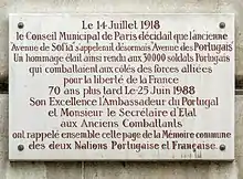 A 14 de julho de 1918, o Conselho Municipal de Paris nomeou a avenue de Sofia (Avenida de Sófia) para avenue des Portugais (Avenida dos Portugueses), em honra ao Corpo Expedicionário Português que lutou em França durante a Primeira Guerra Mundial.[5]