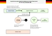 A primeira ordem constitucional do Império Alemão foi a Lei Imperial relativa à introdução de um Poder Central provisório para a Alemanha, em 28 de junho de 1848. Com a ordem, o Parlamento de Frankfurt estabeleceu os cargos de Reichsverweser (Regente Imperial, um monarca provisório) e de ministros imperiais. Uma segunda ordem constitucional, a Constituição de Frankfurt, em 28 de março de 1849, foi aceita por 28 estados alemães, mas não pelos maiores. A Prússia, juntamente com outros estados alemães, forçou a dissolução do Parlamento de Frankfurt.[5]