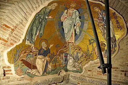 Em 527, Justiniano (r. 527–565), sobrinho de Justino I (r. 518–527), assume o trono.[77] Em 529, uma comissão de dez homens sob João da Capadócia e Triboniano revisou o código legal romano e criou nova codificação de leis e extratos de juristas; em 534, o código foi atualizado e, juntamente com as Novelas (decretos promulgados pelo imperador até 534), formou o sistema legal usado durante a maior parte do período bizantino.[78] Em 532, com a morte do xá Cavades I (r. 488–496; 499–531), Justiniano firmou a chamada Paz Eterna com o seu filho e sucessor, Cosroes I (r. 531–579), concluindo assim a Guerra Ibérica que havia sido iniciada em 526.[79] No mesmo ano, o imperador sobreviveu a uma revolta em Constantinopla (a Revolta de Nica), que terminou com a morte de cerca de 30 a 35 mil revoltosos.[80][81] Esta vitória consolidou o poder de Justiniano.[82] No rescaldo do evento, o imperador empreendeu um extenso programa de reparação e ampliação dos edifícios danificados, entre os quais o mais famoso, a Basílica de Santa Sofia, perdura até a atualidade como um dos principais monumentos da arquitetura bizantina.[83]
