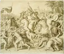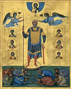 Focas, um líder impopular invariavelmente descrito como "tirano", foi alvo de conspirações lideradas pelo senado. Foi deposto em 610 por Heráclio, que rumou para Constantinopla de Cartago com um ícone posto na proa de seu navio.[121][122] Em sua ascensão, os sassânidas avançaram profundamente na Ásia Menor, ocupando importantes cidades do Oriente como Damasco e Jerusalém e levando a Vera Cruz para sua capital, Ctesifonte.[123] A contraofensiva de Heráclio assumiu caráter de guerra santa, e uma imagem acheiropoieta de Cristo foi usada como estandarte.[124][125] De mesmo modo, quando Constantinopla foi salva do cerco avar em 626, a vitória foi atribuída ao ícone da Virgem, que foi levado em procissão pelo patriarca Sérgio I sobre os muros.[126] A principal força persa foi destruída em Nínive em 627 e Heráclio restaurou a Vera Cruz em cerimônia majestosa em 629.[122][127][128] A guerra esgotou os Impérios Bizantino e Sassânida, e deixou-os vulneráveis aos árabes muçulmanas que surgiram nos anos seguintes.[129] Os romanos sofreram uma esmagadora derrota para os árabes na Batalha de Jarmuque, em 636, e Ctesifonte caiu em 637.[130]