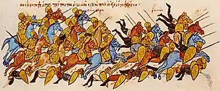 Sob liderança de Crum (r. 803–811), a ameaça búlgara reapareceu: cidades como Sérdica (atual Sófia)[155] e Adrianópolis[156] foram sitiadas e tomadas, enquanto em Plisca (811)[157] e Versinícia (813)[158] o império foi decisivamente derrotado; em 814, o filho de Crum, Omurtague (r. 815–831), negociou a paz.[159] Aproveitando as revoltas de Tomás, o Eslavo e Eufêmio na década de 820, o Califado Abássida capturou Creta em 824, enquanto o Emirado Aglábida atacou a Sicília, sitiando Siracusa e conquistando Palermo (831);[160] Amório, na Anatólia, foi destruída pelos abássidas em 838.[161][162][163][164] Porém, através de operações militares dos imperadores Teófilo (r. 829–842) e Miguel III, o Ébrio (r. 842–867), o Império Bizantino conquistou as cidades de Tarso (831), Melitene e Arsamosata (837), destruiu Sozópetra (837)[165][166] e derrotou decisivamente os árabes em Lalacão (863).[167]