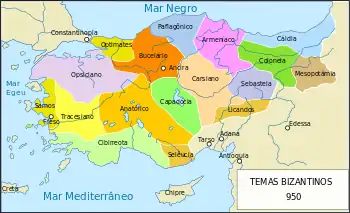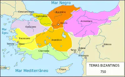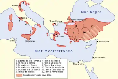 A partir de 649, os árabes conduziram ataques navais contra o império, chegando a controlar Chipre. Já firmemente controlando a Síria e o Levante, enviaram frequentes incursões às profundezas da Anatólia, e entre 674 e 678 cercaram Constantinopla. A frota árabe foi repelida pelo uso de fogo grego, e foi assinada uma trégua de trinta anos entre o Império Bizantino e o Califado Omíada.[131] Contudo, as incursões na Anatólia perduraram e aceleraram o fim da cultura urbana clássica, com os habitantes de muitas cidades refortificando áreas muito menores no interior das muralhas, ou se mudando para fortalezas próximas.[132][133] Constantinopla regrediu em tamanho consideravelmente, com a população diminuindo de 500 mil habitantes para apenas 40 a 70 mil. Isso ocorreu sobretudo após o fim das remessas gratuitas de cereais do Egito, primeiro devido à perda temporária da região aos persas (618–628) e depois à perda definitiva aos árabes em 642.[134][135] O vazio deixado pelo desaparecimento de velhas instituições cívicas semiautônomas foi preenchido pelo sistema das temas, que implicou a divisão da Anatólia em "províncias" ocupadas por exércitos distintos, que assumiram a autoridade civil e respondiam diretamente ao governo imperial. Este sistema pode ter suas raízes em determinadas medidas pontuais adotadas por Heráclio, mas ao longo do século VII se transformou num sistema totalmente novo de governo imperial.[136][137] Tem sido dito que a reestruturação cultural e institucional maciça do império, na sequência das perdas territoriais do século VII, causou a ruptura decisiva entre o antigo Estado romano e aquele dos bizantinos, sendo que ele passou a ser entendido com um estado sucessor, em vez de uma continuação do Império Romano.[138]