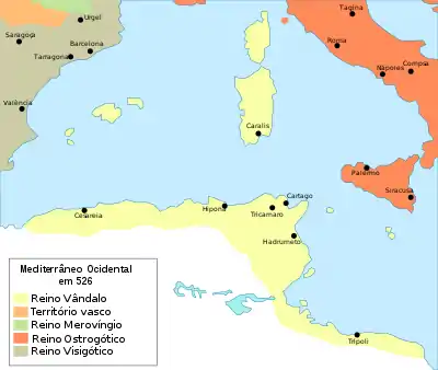 Seu reinado foi caracterizado por uma série de guerras contra os poderes germânicos que culminaria na reconquista de vastas porções do então findado Império Romano do Ocidente. Este período de reconquistas se iniciou em 533, quando o general Belisário foi enviado para recuperar a província da África Proconsular dos vândalos, que controlavam-na desde 429.[84] A Guerra Vândala acabou em 534, mas a província só foi efetivamente tomada em 548,[85] por João Troglita, pois eclodiram várias rebeliões no exército e entre as tribos berberes que residiam na região.[82][86][87] Na Itália, aproveitando-se do assassinato da rainha Amalasunta por Teodato (r. 534–536),[88] Justiniano lançou duas expedições contra o Reino Ostrogótico, uma na Sicília, sob Belisário, e outra na Dalmácia, comandada por Mundo,[89] o que deu início à chamada Guerra Gótica. Os bizantinos conquistaram gradualmente os territórios ostrogodos, capturando as cidades de Ravena, Nápoles e Roma.[90][91] Em 549, Belisário, que estava em Ravena, foi convocado para Constantinopla[92][85] e em seu lugar foi colocado o eunuco armênio Narses, que chegou na Itália no final de 551. Sob o comando de Narses, os bizantinos conseguiram vitórias decisivas contra os reis Tótila (r. 541–552) e Teia (r. 553) que concluíram a guerra, embora os ostrogodos permanecessem resistentes ao domínio imperial por algum tempo.[93][94] Em 551, quando a Guerra Gótica ainda decorria, Atanagildo, um nobre visigodo do Reino Visigótico, procurou a ajuda de Justiniano numa rebelião contra o rei Ágila I (r. 549–551), que enviou uma força sob Libério. O Império Bizantino manteve uma faixa no sul da Hispânia, que ficou conhecida como província da Espânia, até o reinado de Heráclio (r. 610–641).[95][96]