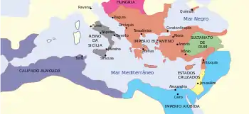 O herdeiro escolhido de João foi seu quarto filho, Manuel I Comneno (r. 1143–1180), que realizou agressivas campanhas contra seus vizinhos no oriente e no ocidente. Na Anatólia, iniciou uma campanha punitiva contra o Sultanato de Rum, atacando sua capital, Icônio (atual Cônia), e aniquilando a cidade fortificada de Filomélio.[248] Além disso, expulsou os turcos da Isáuria.[249] Na Palestina, aliou-se ao Reino de Jerusalém e enviou grande frota para participar de uma invasão combinada do Califado Fatímida. Ele reforçou sua posição como senhor dos Estados cruzados, com hegemonia sobre Antioquia e Jerusalém garantida pelo acordo com Reinaldo (r. 1153–1160), o príncipe de Antioquia, e Amalrico I (r. 1162–1174), o rei de Jerusalém, respectivamente.[250][251]