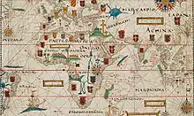 Os portugueses começaram por explorar sistematicamente a costa de África a partir de 1419, com o incentivo do Infante D. Henrique e navegadores experientes servidos pelos mais avançados desenvolvimentos náuticos e cartográficos da época, aperfeiçoando a caravela. Em 1471 chegaram ao Golfo da Guiné, onde em 1482 foi estabelecida a feitoria de São Jorge da Mina para apoiar um florescente comércio de ouro de aluvião. Partindo da Mina Diogo Cão estabelece o primeiro contacto com o Reino do Congo. Após sucessivas viagens exploratórias para sul, em 1488 Bartolomeu Dias dobrou o Cabo da Boa Esperança, entrando pela primeira vez no Oceano Índico a partir do Atlântico.[13]