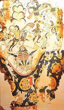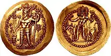 Por volta de 370, no entanto, no final do reinado de Sapor II, os sassânidas perderam o controle de Báctria para os invasores do norte: primeiro os quidaritas, depois os Heftalitas e finalmente os hunos alconos, que seguiriam com a invasão de Índia.[37] Esses invasores inicialmente emitiram moedas com base em desenhos sassânidas.[38] Várias moedas cunhadas em Bactria e baseadas em desenhos sassânidas ainda existem, muitas vezes com bustos imitando os reis sassânidas Sapor II (r. 309 a 379) e Sapor III (r. 383 a 388), adicionando o tanga alcono e o nome "Alcono" em Escrita bactriana no anverso e com atendentes a um altar de fogo no verso.[39]