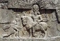 Relevo de face rochosa em Naqsh-e Rostam do imperador persa Sapor I (a cavalo) capturando o imperador romano Valeriano (de pé) e Filipe, o Árabe (ajoelhado), pedindo paz, após a vitória em Edessa