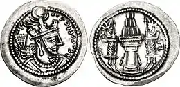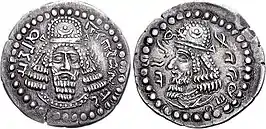 Cunhagem inicial do fundador Artaxes I, como Rei de Pérsis Artaxerxes (Ardaxir) V. Cerca de 205 /6–223/ 4 na Era Comum. Obv: Cabeça barbada, usando diadema e tiara no estilo parta, legenda "O divino Ardaxir, rei" em pálavi. Rev: Cabeça barbada de Pabeco, usando diadema e tiara de estilo parta, com legenda "filho da divindade Pabeco, rei" em pálavi