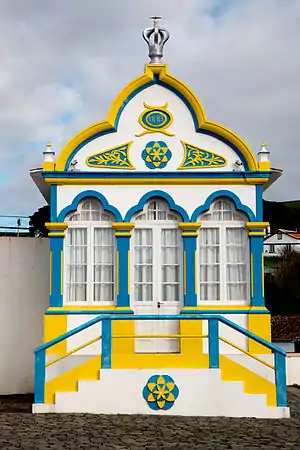 Este império apresenta na parte superior um frontão que encima a fachada principal e é igualmente trilobado, e tem o topo rematado por uma coroa do Divino Espírito Santo. A cobertura apresenta-se com duas águas em telha de meia-cana e rematada por beiral simples. No tímpano existe uma cartela onde está aposta a data "1885". Por baixo desta cartela existe uma roseta de seis folhas ladeada por elementos decorativos representado motivos vegetalistas.