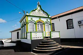 No intradorso da porta formado pelo vão central da fachada principal e nos cunhais da fachada existem colunelos torsos. Os restantes vãos são janelas com uma almofada no avental. A fachada é encimada por um frontão contracurvado dotado de ressaltos, ladeado de pináculos e rematado por uma coroa do Espírito Santo.