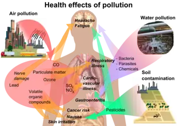 Os pesticidas podem entrar no corpo através da inalação de aerossóis, poeira e vapores que contenham pesticidas; por exposição oral por ingestão de alimentos/água; e através da exposição da pele por contato direto.[65] Os pesticidas percolama nos solos e nas águas subterrâneas, e podem acabar na água potável, assim como e a pulverização de pesticidas pode poluir o ar.