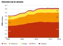Modelagens ambientais indicam que globalmente mais de 60% das terras agrícolas (~24,5 milhões de km²) está "em risco de poluição por pesticidas por mais de um ingrediente ativo", e que mais de 30% está em "alto risco", dos quais um terço está em regiões de alta biodiversidade.[4][5] Cada pesticida ou classe de pesticida vem com um conjunto específico de preocupações ambientais. Tais efeitos indesejáveis levaram ao banimento de muitos pesticidas, enquanto a regulamentação limitou e/ou reduziu o uso de outros. A disseminação global do uso de pesticidas, incluindo o uso de pesticidas mais antigos/obsoletos que foram proibidos em algumas jurisdições, aumentou em geral.[6][7]