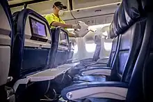 De acordo com Centros de Controle e Prevenção de Doenças, se uma pessoa ficar doente em um avião, os controles de risco adequados para proteger os trabalhadores e outros passageiros incluem separar a pessoa doente de outras pessoas a uma distância de 6 pés, designando um membro da tripulação para servir os passageiros. doente e oferecendo uma máscara cirúrgica ao doente ou pedindo que o doente cubra a boca e o nariz com lenços quando tossir ou espirrar. A tripulação da cabine deve usar luvas descartáveis ao atender um viajante doente ou tocar em fluidos corporais ou superfícies potencialmente contaminadas e possivelmente equipamento de proteção individual adicional se o viajante doente tiver febre, tosse persistente ou dificuldade em respirar. Luvas e outros itens descartáveis devem ser descartados em um saco de risco biológico e as superfícies contaminadas devem ser limpas e desinfetadas posteriormente.[59]