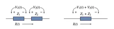Assim, podemos generalizar as mesmas regras de combinação de resistências em série ao caso de condensadores e indutores, como ilustra a figura ao lado. Nomeadamente, quando dois dispositivos são ligados em série, o sistema pode ser substituído por um único dispositivo com impedância igual à soma das impedâncias dos dois dispositivos:[1]