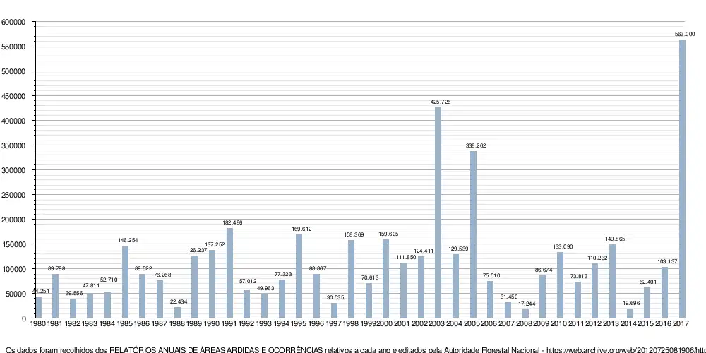 2008 foi o ano em que a área ardida foi menor desde 1980. O pior ano foi 2017[8]. O gráfico apresenta a evolução da área de floresta ardida em virtude de incêndios florestais em território nacional desde 1980.