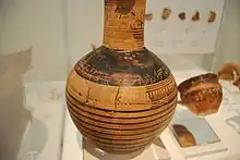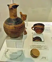 O texto está escrito em uma forma arcaica do alfabeto grego, com algumas formas de letras ainda se assemelhando às do alfabeto fenício original. Por exemplo, a letra grega zeta (Ζ) se assemelha à letra fenícia zaim (I). O texto é escrito da direita para a esquerda, com as letras individuais em forma de espelho em comparação com as formas modernas. Está colocado em um círculo ao redor do ombro do vaso. O texto consiste em 46 caracteres, dos quais os primeiros 35 podem ser facilmente lidos como um verso hexamétrico em grego antigo. O restante fragmentário acredita-se ser o início do segundo verso, mas a interpretação exata é incerta. B. Powell argumentou que os caracteres finais podem representar um fragmento embaralhado de um abecedário (ΚΛΜΝ) por uma segunda mão, alguém aprendendo a escrever.[1] Mais recentemente, N. M. Binek mostrou que as últimas seis marcações podem "ser vistas não como letras ou como tentativas de inscrever letras, mas sim como elementos decorativos criados por um segundo inscritor de acordo com os princípios do idiomático Geométrico", na medida em que o segmento espelha aproximadamente as formas das letras 9-4 (ΧΡΟΝΥΝ).[2] O texto marca o vaso como um prêmio em uma competição de dança. É traduzido como: "quem dos dançarinos agora dança mais levemente ...", e a segunda linha é conjecturada para ter dito algo como "... ele receberá isto (vaso como seu prêmio)".