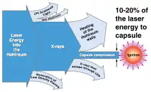 O NIF hospeda o laser mais energético do mundo. O laser aquece a camada externa de uma pequena esfera de plástico. A energia é tão intensa que faz com que o plástico imploda, espremendo o combustível para dentro. O plástico atinge uma velocidade máxima de 350 km/s,[2] elevando a densidade do combustível de aproximadamente a da água para cerca de 100 vezes a do chumbo. A entrega de energia e o processo adiabático durante a implosão aumentam a temperatura do combustível para centenas de milhões de graus. Nessas temperaturas, os processos de fusão ocorrem no pequeno intervalo antes que o combustível exploda.