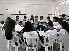 À escolha das obras associa-se a metodologia do projeto, desenvolvida pela psicanalista Catalina Pagés[16]. Sentados em círculos, os participantes leem em voz alta e refletem sobre as ideias contidas no texto. Nas palavras de Catalina, coordenadora-geral do projeto, o princípio da metodologia é simples: “lemos para recuperar aquele saber que nos deixa sonhar”. Atualmente, os Círculos de Leitura acontecem em 14 escolas da região metropolitana de São Paulo e em 157 no estado do Ceará, onde uma parceria institucional com a Secretaria de Educação[17] permitiu a expansão do projeto ao longo dos anos. Ao todo, as leituras impactam 18.000 estudantes ao ano em 171 escolas públicas do país.