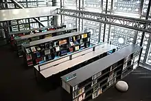 Após três anos de trabalho, a biblioteca do IMA foi reaberta em 31 de março de 2017.[12] Elle propose 150 places assises sur trois salles de lecture reliées par la Tour des Livres dont les parois garnies des collections de littérature[13] Ela dispõe de 150 lugares em três salas de leitura ligadas pela Torre dos Livros, cujas paredes são revestidas por coleções de literatura.[13]