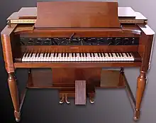 Em 1929, Laurens Hammond estabeleceu sua empresa para a fabricação de instrumentos eletrônicos. Ele passou a produzir o órgão Hammond, que se baseava nos princípios do telarmônio, juntamente com outros desenvolvimentos, incluindo as primeiras unidades de reverberação.[16] O órgão Hammond é um instrumento eletromecânico, pois usava elementos mecânicos e peças eletrônicas. Um órgão Hammond usava rodas de tom de metal giratórias para produzir sons diferentes. Um captador magnético com design semelhante ao dos captadores de uma guitarra elétrica é usado para transmitir os tons nas rodas de tom para um amplificador e caixa de alto-falante. Embora o órgão Hammond tenha sido projetado para ser uma alternativa de baixo custo a um órgão de tubos para música de igreja, os músicos logo descobriram que o Hammond era um excelente instrumento para blues e jazz, na verdade, todo um gênero de música foi desenvolvido em torno desse instrumento, conhecido como trio de órgão (normalmente órgão Hammond, bateria e um terceiro instrumento, saxofone ou guitarra).