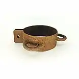 Aos cativos que tivessem um comportamento reprobatório, eram atribuídas gargalheiras prendidas ao pescoço. O objeto possuía um corpo de ferro fundido, com arcos unidos por elos alongados e arredondados nas partes externas para prender o pescoço do cativo, além de orifícios para amarrá-lo ao próprio corpo ou a outros escravos em momentos de deslocamento[2]. Essa peça tinha como objetivo manter os escravos intitulados como indolentes, contidos e submissos[3].