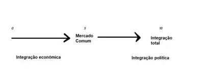 Essa cooperação geralmente começa com a integração econômica e, à medida que continua, passa a incluir a integração política. Podemos descrever a integração como uma escala, no qual inicialmente não há nenhuma nenhuma integração entre dois ou mais países. O ponto máximo representaria a integração completa entre dois ou mais países. Isso significa que os estados integradores se tornariam de fato um novo país – em outras palavras, integração total. A fase intermediária, epresenta o mercado único, ou seja, a conclusão da integração econômica.[1]