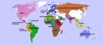 A integração regional na Europa foi consolidada no Tratado da União Européia (o Tratado de Maastricht), que entrou em vigor em novembro de 1993 e estabeleceu a União Européia. A Associação Européia de Livre Comércio é um bloco de livre comércio formado por quatro países (Islândia, Liechtenstein, Suíça e Noruega) que opera em paralelo e está vinculado à União Européia. Em janeiro de 1994, o Acordo de Livre Comércio da América do Norte foi formado quando o México aderiu a um acordo bilateral de livre comércio anterior entre os EUA e o Canadá. No Pacífico, houve a Área de Livre Comércio da ASEAN (AFTA) em 1993, que procurou reduzir as tarifas. A AFTA começou a todo vapor em 2000.[19]