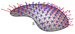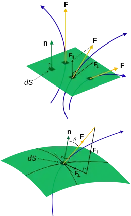 onde, é o campo normal escolhido na orientação da superfície. O integrando na forma de produto escalar evidencia que somente as componentes do campo perpendiculares à superfície contribuirão no cálculo do fluxo.[4]