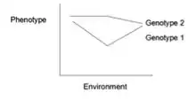 A interação gene-ambiente (ou interação genótipo-ambiente ou G×E) ocorre quando dois genótipos diferentes respondem à variação ambiental de maneiras diferentes. Uma norma de reação é um gráfico que mostra a relação entre genes e fatores ambientais quando as diferenças fenotípicas são contínuas.[1] Eles podem ajudar a ilustrar as interações GxE. Quando a norma de reação não é paralela, como mostrado na figura abaixo, há uma interação gene por ambiente. Isso indica que cada genótipo responde à variação ambiental de uma maneira diferente.[2]