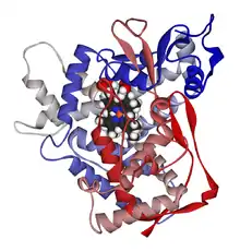 Diagrama da isoenzima 2C9 do citocromo P450 com o grupo heme no centro da enzima.