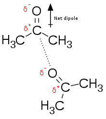 Por exemplo, acetona, o ingrediente ativo em alguns removedores de esmalte, tem um dipolo líquido associado ao carbonil (veja a figura 2). Como o oxigênio é mais eletronegativo do que o carbono que está ligado covalentemente a ele, os elétrons associados a essa ligação estarão mais próximos do oxigênio do que do carbono, criando uma carga parcial negativa (δ−) no oxigênio, e uma carga parcial positiva (δ+) no carbono. Eles não são cargas completas porque os elétrons ainda são compartilhados através de uma ligação covalente entre o oxigênio e o carbono. Se os elétrons não fossem mais compartilhados, a ligação oxigênio-carbono seria uma interação eletrostática.