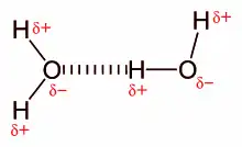 A ligação de hidrogênio (ligação H) é um tipo específico de interação que envolve a atração dipolo-dipolo entre um átomo de hidrogênio parcialmente positivo e um átomo de oxigênio, nitrogênio, enxofre ou flúor altamente eletronegativo e parcialmente negativo (não ligado covalentemente ao referido átomo de hidrogênio). Não é uma ligação covalente, mas, em vez disso, é classificada como uma interação não covalente forte. É responsável por porque a água é um líquido à temperatura ambiente e não um gás (dado o baixo peso molecular da água). Mais comumente, a força das ligações de hidrogênio fica entre 0-4 kcal/mol, mas às vezes pode ser tão forte quanto 40 kcal/mol.[3] Em solventes tais como clorofórmio ou tetracloreto de carbono, observa-se e.g. para a interação entre valores aditivos de amidas de cerca de 5 kJ/mol. De acordo com Linus Pauling, a força de uma ligação de hidrogênio é essencialmente determinada pelas cargas eletrostáticas. Medições de milhares de complexos em clorofórmio ou tetracloreto de carbono levaram a incrementos de energia livre para todos os tipos de combinações doador-aceitador.[10][11]