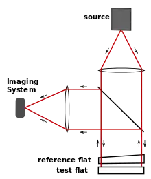 Interferômetros de Fizeau são comumente usados para medição da forma de uma superfície óptica: Tipicamente, uma lente ou espelho fabricado é comparado a uma peça de referência que tenha a forma desejada. Na Figura 1, o interferômetro de Fizeau é mostrado como pode ser configurado para testar um plano óptico. Um plano de referência precisamente figurado é colocado em cima da do plano que está sendo testado, separado por espaçadores estreitos. O plano de referência é levemente chanfrado (apenas uma fracão de um grau de chanfro é necessário) para prevenir que a superfície traseira do plano produza franjas de interferência. Um feixe colimado de luz monocromática ilumina os dois planos, e o divisor de feixes permite que as franjas sejam vistas sobre o eixo.[2][3]